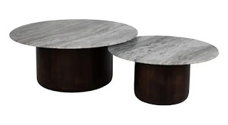 Conjunto de mesas de centro redondas com tampos em mármore claro e bases cilíndricas em madeira escura. Design moderno e elegante, ideal para ambientes sofisticados e minimalistas.